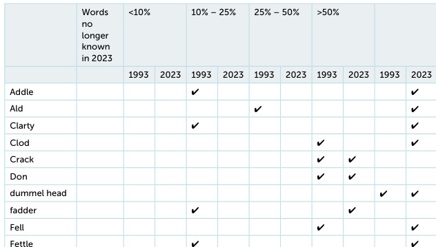 We learned about which words seemed to be decline in surveys across the years between the 1993 an 2003 surveys, but more positively about the longer list of words on the up. The picture on the right is an extract from the table showing these words in Neil's article Fell Talk in the September 2023 emagazine.